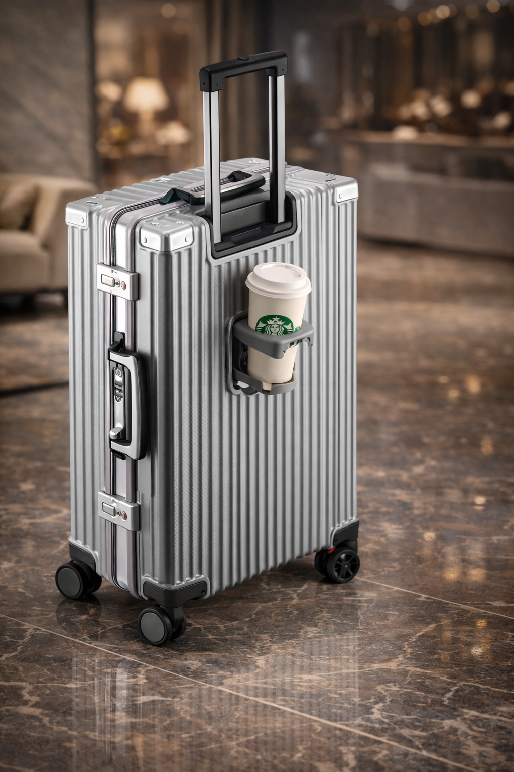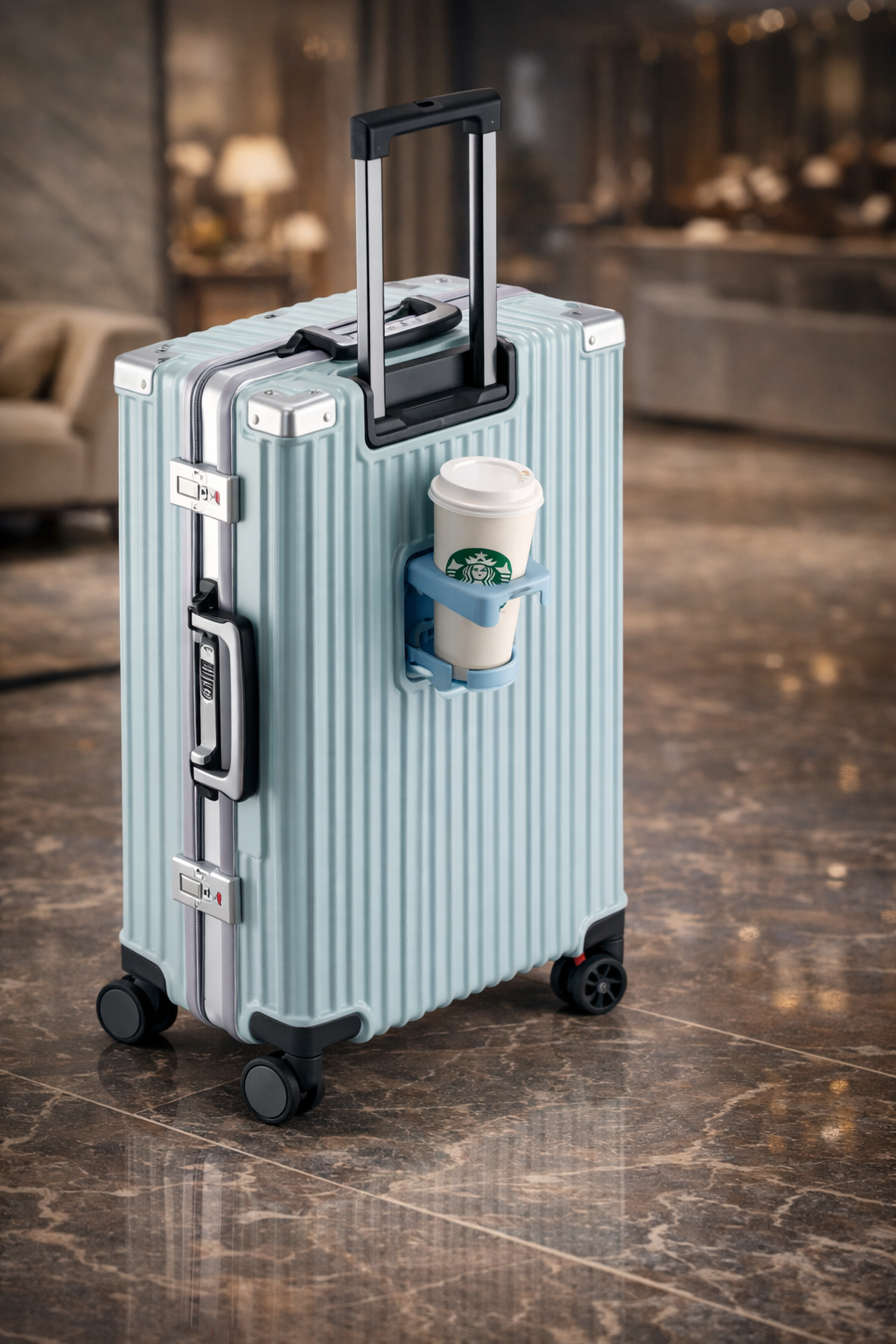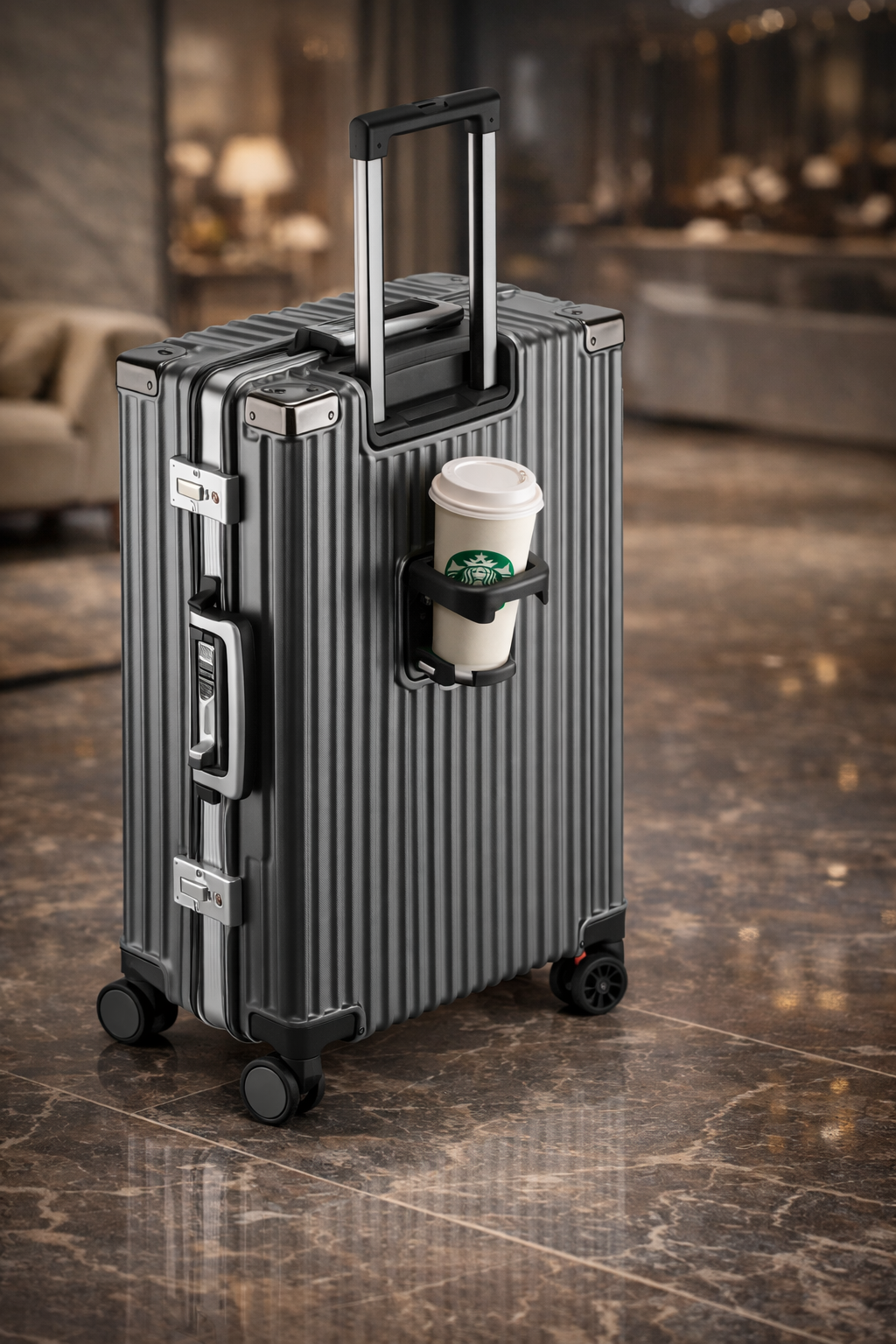 El portavasos integrado mantiene tu bebida segura y accesible mientras te desplazas por el aeropuerto con total comodidad.