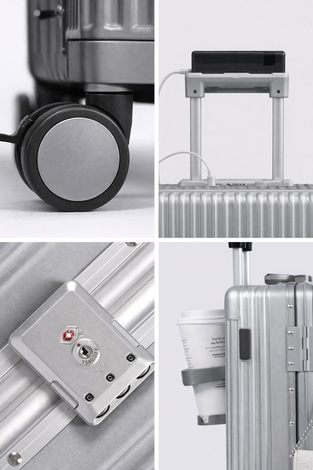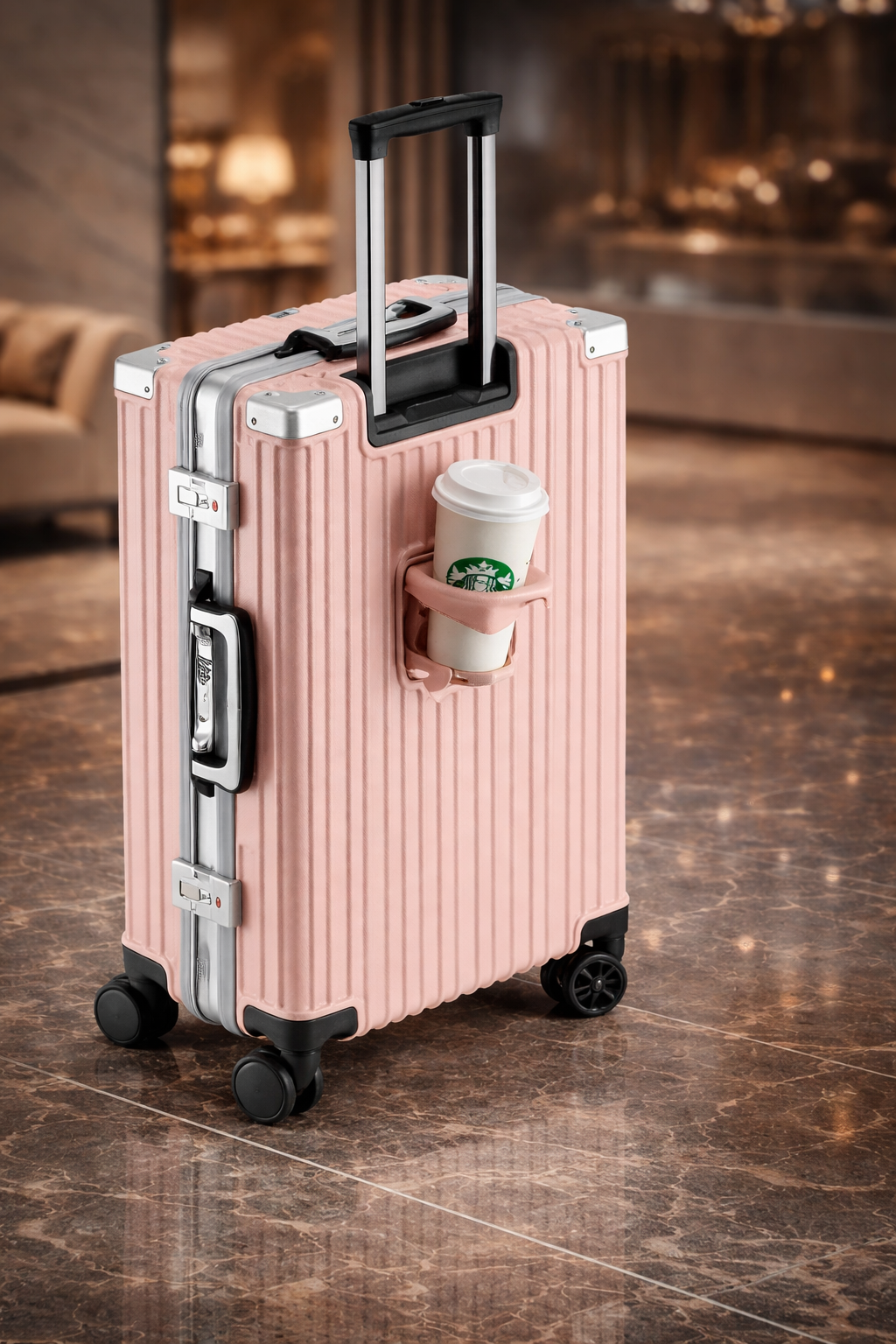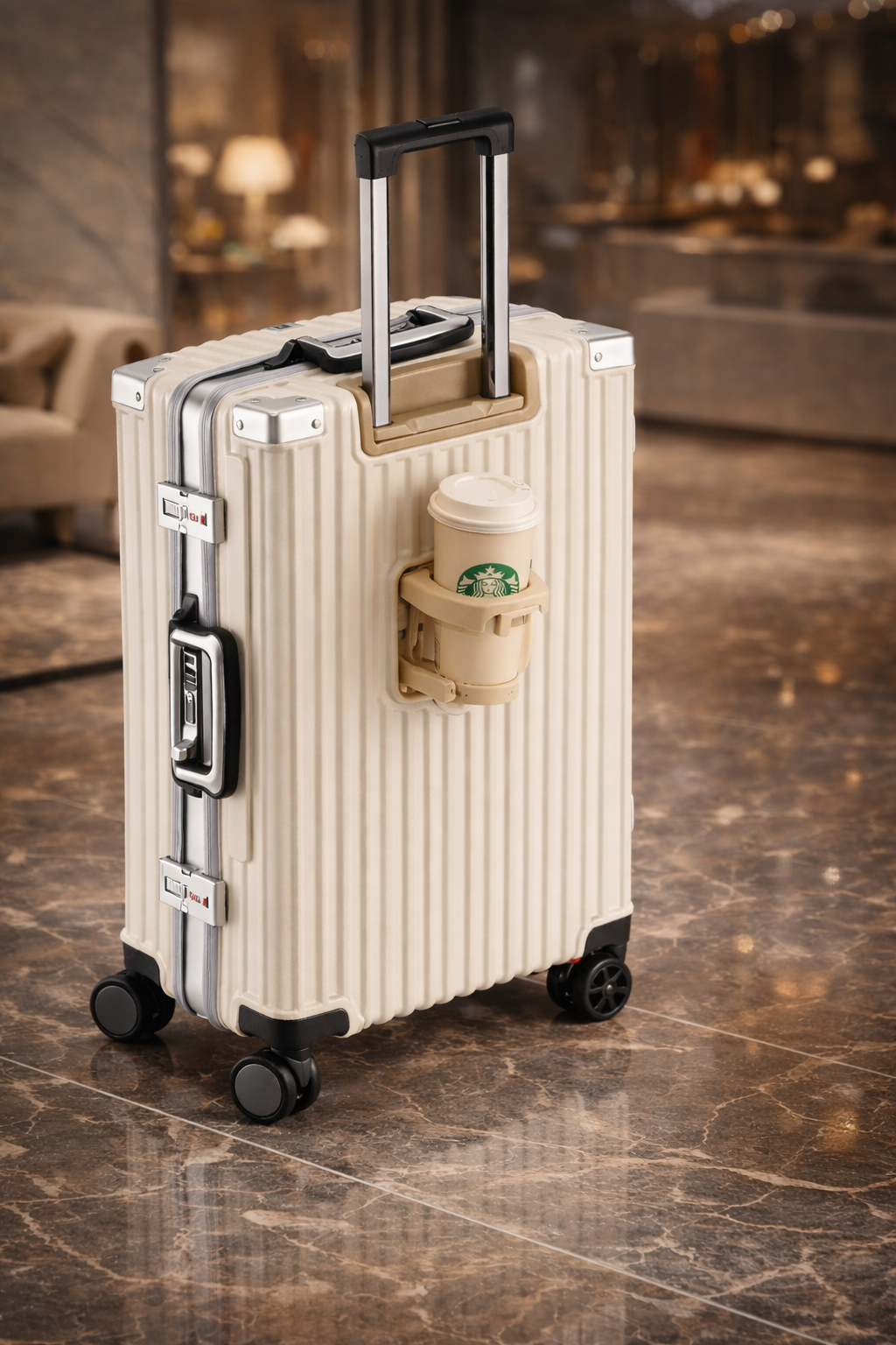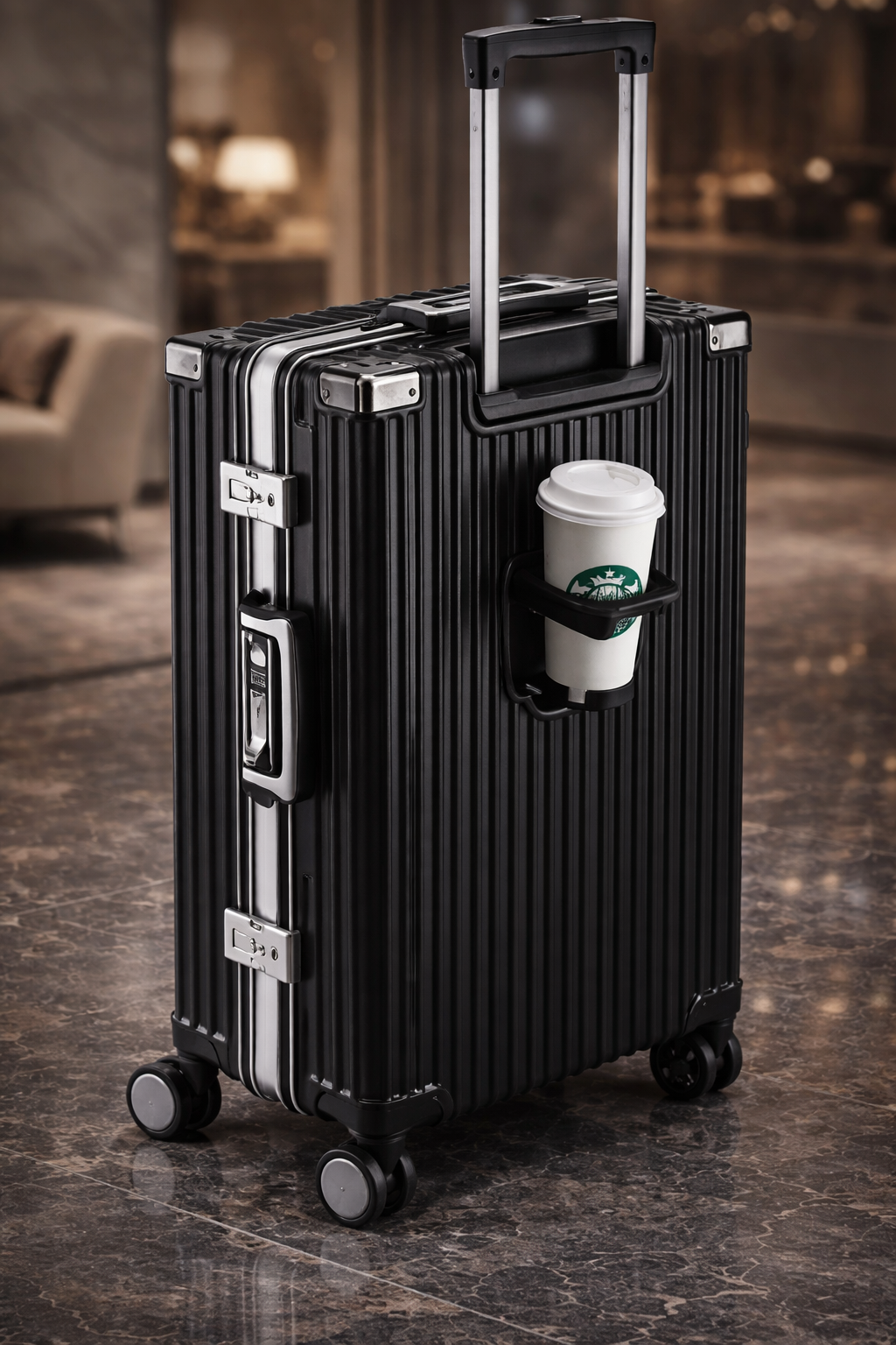 El portavasos integrado mantiene tu bebida segura y accesible mientras te desplazas por el aeropuerto con total comodidad.